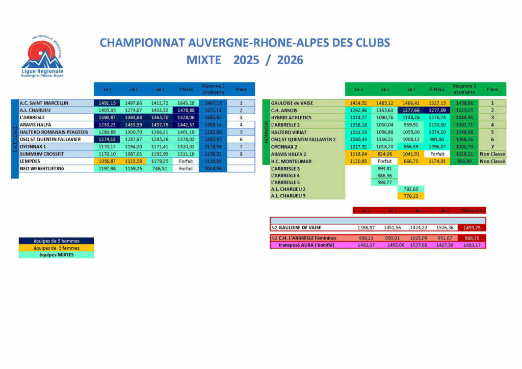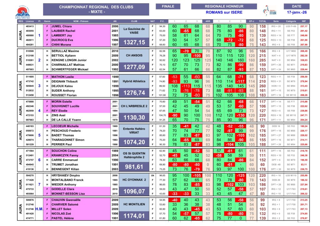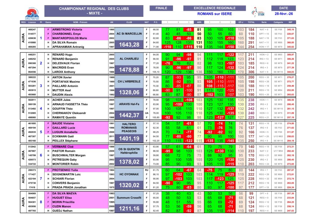 Enfin le club ligérien de Charlieu (1433 points) emmenée par Evan Macridis (298 pts) gagne à domicile contre Lempdes AC (1179 points), Oyonnax (1171 points) et Néo Weightlifting (746 points). Avec ce très bon résultat le club de la Loire assure sa place pour la finale et reste juste devant Aravis Hal-Fa avec seulement 3 points d’avance !